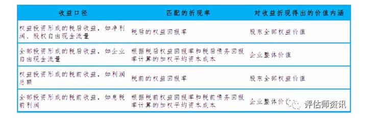折現(xiàn)率是將未來(lái)預(yù)期收益折算成現(xiàn)值的比率,是與企業(yè)未來(lái)收益風(fēng)險(xiǎn)程度相對(duì)應(yīng)的期望報(bào)酬率,折現(xiàn)率的選取需與相應(yīng)收益的口徑相匹配。