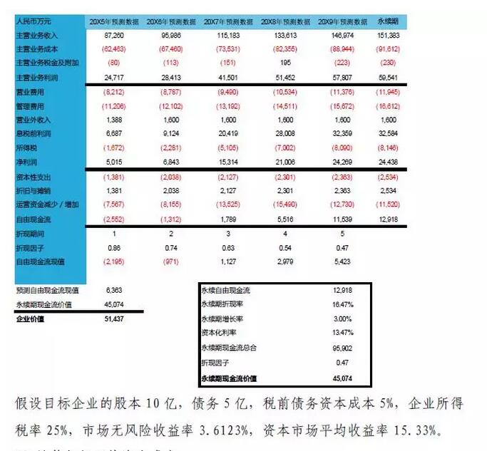 在此基礎(chǔ)上,評(píng)估人員進(jìn)一步考慮貨幣的時(shí)間價(jià)值、通貨膨脹、以及被評(píng)估資產(chǎn)的有關(guān)風(fēng)險(xiǎn),選取了合適的折現(xiàn)率,得到目標(biāo)公司的股權(quán)的公允價(jià)值。
