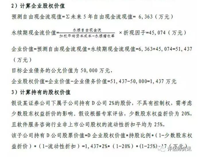 在運(yùn)用企業(yè)價(jià)值倍數(shù)法計(jì)算得出目標(biāo)企業(yè)價(jià)值,扣減凈負(fù)債并對(duì)非經(jīng)營(yíng)性資產(chǎn)和負(fù)債以及少數(shù)股東權(quán)益進(jìn)行調(diào)整得出企業(yè)全部股權(quán)價(jià)值后,按照持股比例計(jì)算股權(quán)價(jià)值,再扣減股權(quán)流動(dòng)性折扣,得出非上市公司股權(quán)價(jià)值。